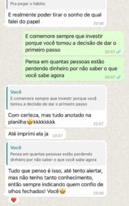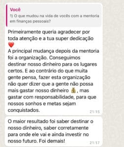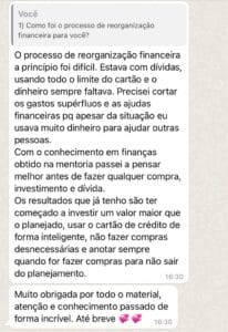 Como bônus você irá receber as planilhas específicas para acompanhamento, os materiais de apoio para as sessões, ferramentas de finanças comportamentais, acesso a vários dos meus minicursos de finanças e o meu acompanhamento pelo WhatsApp.
